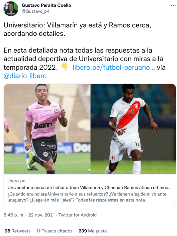 “Universitario: Villamarín ya está y Ramos cerca, acordando detalles”, escribió Gustavo Peralta de ESPN y Líbero en twitter. Con esto, va quedando claro qué equipo piensan para el 2022. Falta, ahora, cerrar con el volante extranjero y quizás algún nacional más. A tener paciencia que falta mucho.