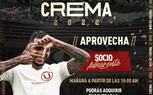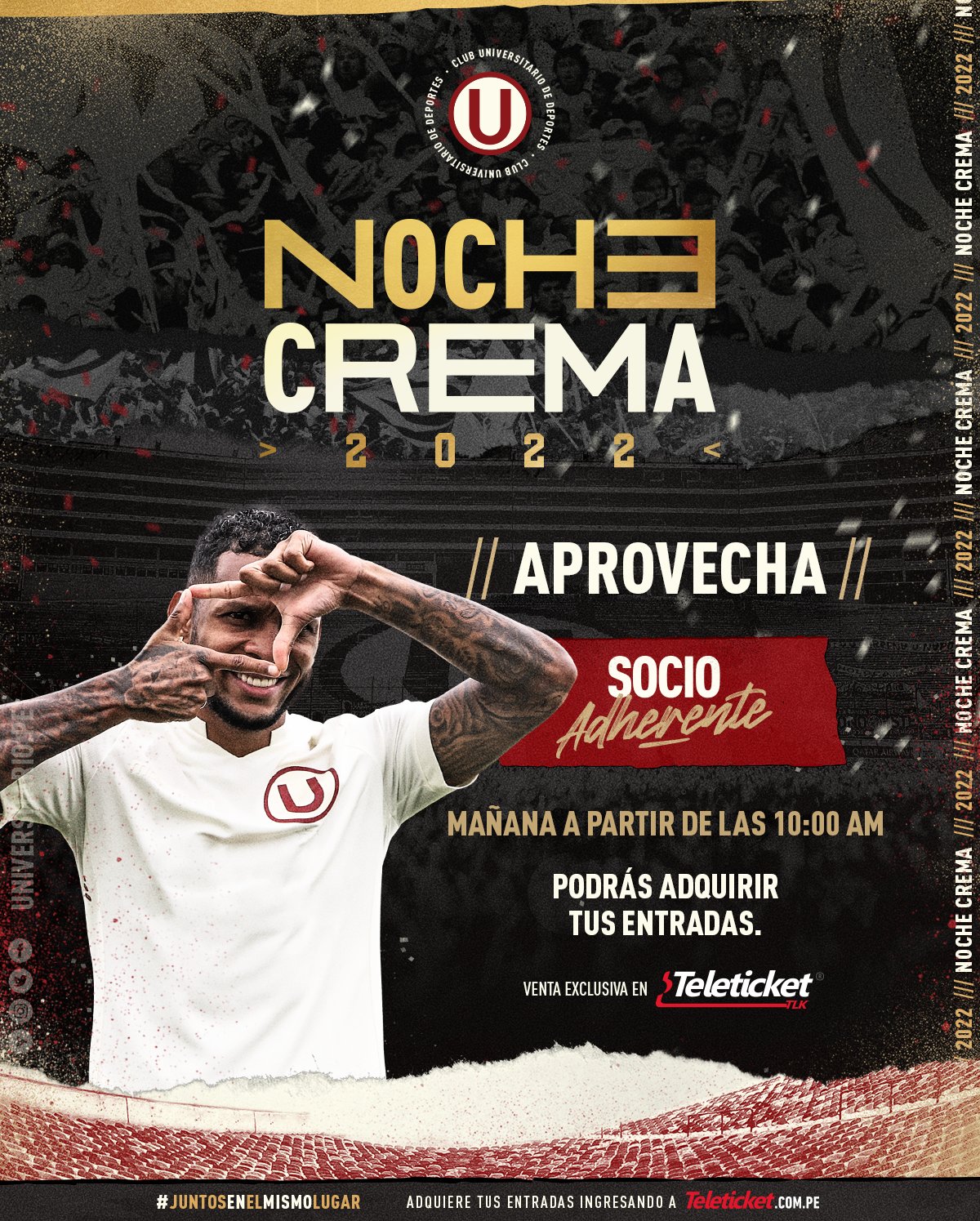 Debido a ello, las redes sociales del club Universitario de Deportes difundieron este jueves 30 de diciembre desde cuándo se empezarán a vender las entradas para su tan ansiada Noche Crema 2022. En este sentido, también es vital recordar los precios de los ticketes. Entendiendo que todas se venden en Teleticket, los precios son en Sur y Norte a 50 soles, Oriente por 150 soles y Occidente en 220 soles.