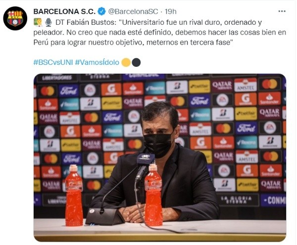 Fabián Bustos ha dejado en claro su presente diciendo: “Mi mente está puesta en el partido del sábado (como local contra Técnico Universitario, por la segunda fecha de la LigaPro)”, agregó en la conferencia de prensa tras finalizar el encuentro frente a Universitario de Deportes por la Copa Libertadores, donde logró una victoria para el Barcelona SC.
