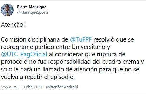 “Comisión disciplinaria de FPF resolvió que se reprograme partido entre Universitario y UTC al considerar que ruptura de protocolo no fue responsabilidad del cuadro crema y solo le hará un llamado de atención para que no se vuelva a repetir el episodio”, escribió.