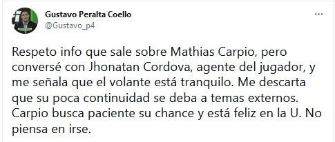 “Respeto info que sale sobre Mathias Carpio, pero conversé con Jhonatan Cordova, agente del jugador, y me señala que el volante está tranquilo. Me descarta que su poca continuidad se deba a temas externos. Carpio busca paciente su chance y está feliz en la U. No piensa en irse”, señaló.