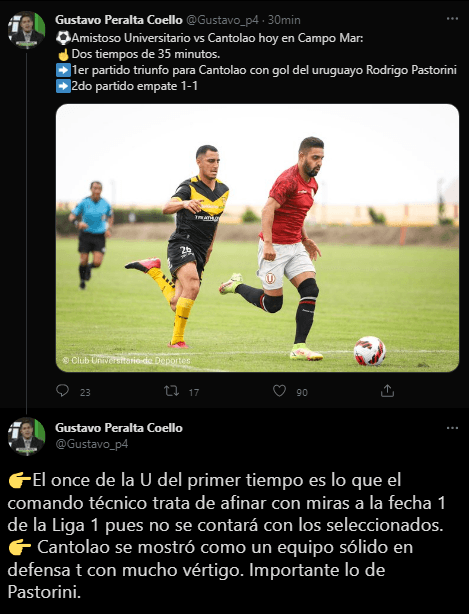 “Amistoso Universitario vs. Cantolao hoy en Campo Mar: Dos tiempos de 35 minutos. 1.er partido triunfo para Cantolao con gol del uruguayo Rodrigo Pastorini. 2.º partido empate 1-1. El once de la U del primer tiempo es lo que el comando técnico trata de afinar con miras a la fecha 1 de la Liga 1 pues no se contará con los seleccionados. Cantolao se mostró como un equipo sólido en defensa con mucho vértigo. Importante lo de Pastorini”.