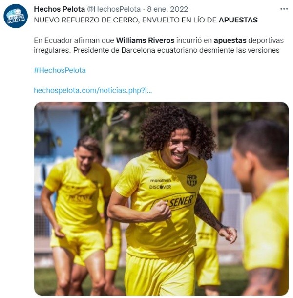 Según la información, el defensor paraguayo Williams Riveros había realizado apuestas deportivas en contra de Barcelona de Guayaquil, club para el que jugaba. Este hecho nunca se comprobó, pero lo que sí es cierto es que hasta el presidente del cuadro ecuatoriano salió a desmendir la situación.