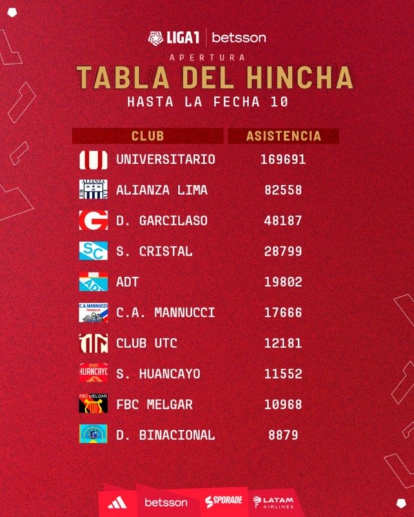Levantando una polémica nacional, este jueves 13 de abril la Liga de Fútbol Profesional publicó el ránking de los clubes que llevan más hinchas al estadio. Tomando en cuenta solo las primeras diez fechas del Torneo Apertura de la Liga 1, la tabla tiene un claro ganador: Universitario de Deportes.