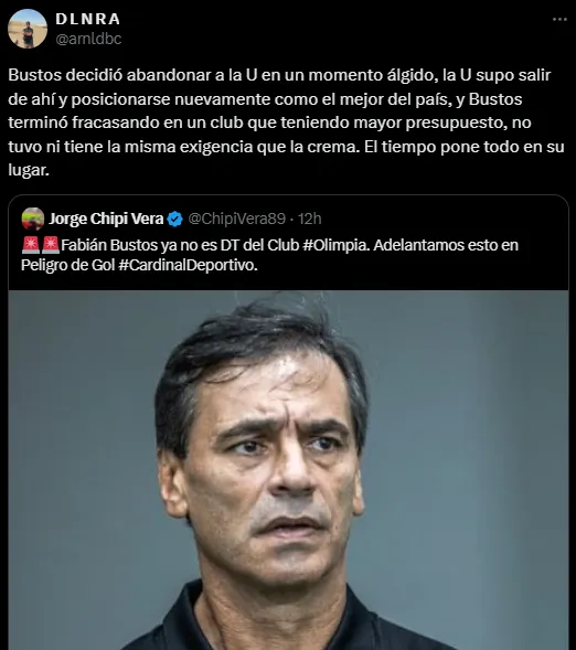 “En Universitario tenías todo“, le dijo un usuario identificado con el conjunto crema, con cierto tono de resignación y lamento. Mientras que otro fue más duro: “Bustos decidió abandonar a la U en un momento álgido, la U supo salir de ahí y posicionarse nuevamente como el mejor del país (…) El tiempo pone todo en su lugar“.