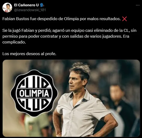 Tras la derrota 4-3 ante Sportivo Trinidense, en Olimpia decidieron interrumpir el vínculo de Fabián Bustos. Dirigió sólo 14 partidos donde apenas ganó 3, empató 8 y perdió los restantes 3, es decir un 40,48 por ciento de efectividad. Cabe destacar que, además de no pelear por el Torneo Apertura, quedó eliminado de la Copa Libertadores 2025 (y sin llegar a la Sudamericana).