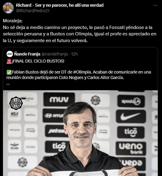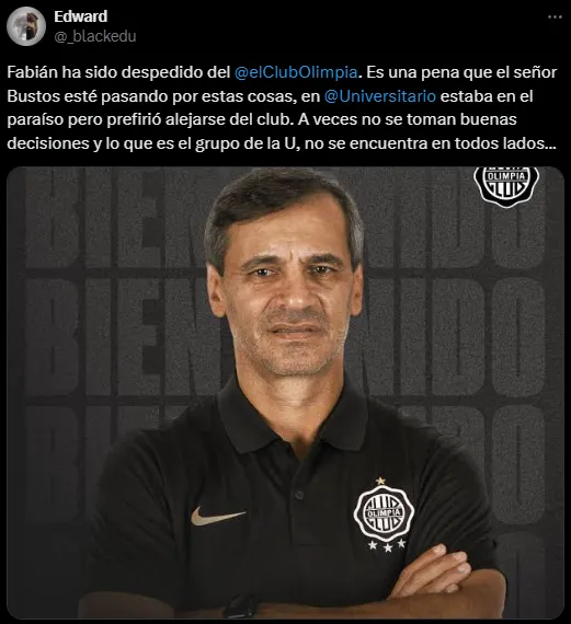 Fabián Bustos dejó de ser el entrenador de Olimpia de Paraguay. Fue despedido por la dirigencia del ‘Decano’ que, rápidamente, lo reemplaza con Ramón Díaz, según información de ABC y el periodista César Luis Merlo. Tras la noticia, hinchas de Universitario, su ex club, reaccionaron de diferente forma.