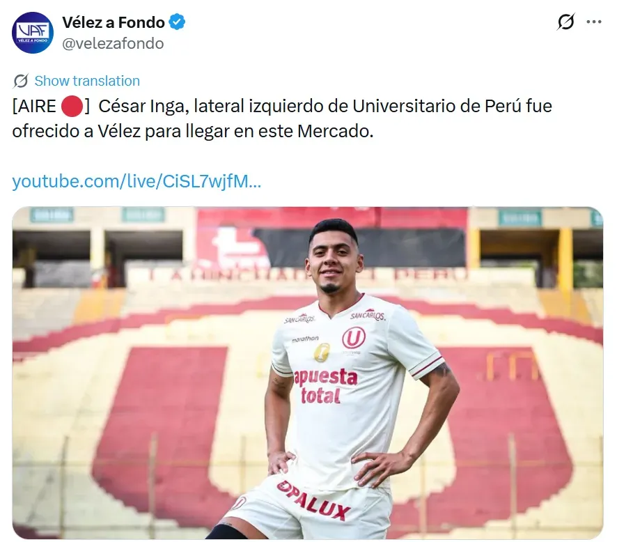 - César Inga, lateral de Universitario de Deportes, fue “ofrecido a Vélez Sarsfield para llegar en este mercado”, según el tweet de ‘Velez a Fondo’.
