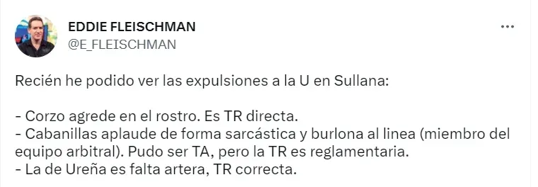 Partiendo de la ejecución del estricto reglamento, Eddie Fleischman justificó sus puntos y validó las 3 expulsiones que sufrió Universitario.