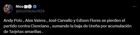 “Andy Polo, Alex Valera, José Carvallo y Edison Flores se pierden el partido contra Cienciano, sumando la baja de Ureña por acumulación de Tarjetas amarillas”. Precisó en su cuenta de Twitter, donde expuso las ausencias que tendrá la “U” para jugar contra los cusqueños.