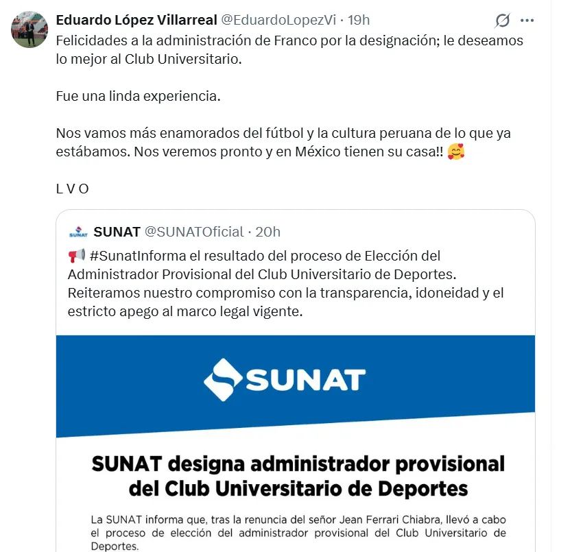 “Felicidades a la administración de Franco (Velazco) por la designación; le deseamos lo mejor al Club Universitario. Fue una linda experiencia. Nos vamos más enamorados del fútbol y la cultura peruana de lo que ya estábamos. ¡Nos veremos pronto y en México tienen su casa!”, se puede leer en el tweet.