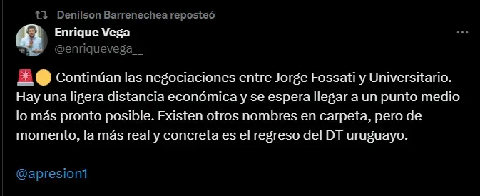 “Continúan las negociaciones entre Jorge Fossati y Universitario. Hay una ligera distancia económica y se espera llegar a un punto medio lo más pronto posible. Existen otros nombres en carpeta, pero de momento, la más real y concreta es el regreso del DT uruguayo”; informó el mencionado comunicador deportivo a través de su cuenta oficial de ‘X’.
