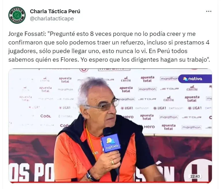 “Pregunté esto 8 veces porque no lo podía creer y me confirmaron que solo podemos traer un refuerzo”, comentó Jorge Fossati.