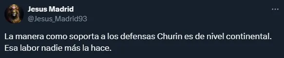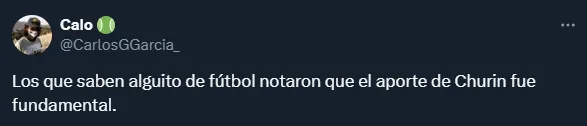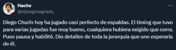 “Diego Churín hoy ha jugado casi perfecto de espaldas. El timing que tuvo para varias jugadas fue muy bueno, cualquiera hubiera exigido que corra. Puso pausa y habilitó. Dio detalles de toda la jerarquía que uno esperaría de él“, fue otro comentario sobre el argentino.