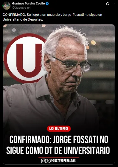 Varios periodistas como Gustavo Peralta y otras fuentes aseguraron que se llegó a un acuerdo para la salida de Jorge Fossati. El uruguayo buscó un nuevo contrato con mejores condiciones, pero desde Universitario de Deportes se pusieron firmes en mantener el contrato actual. La situación no prosperó y terminó con este abrupto adiós.