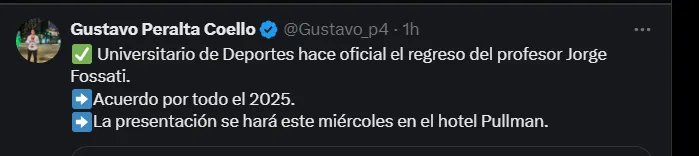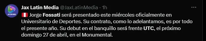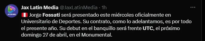 A través de ‘X’, antes conocido como Twitter‘, el portal ‘MrOFF’ publicó lo siguiente: “Jorge Fossati ha sido oficializado como nuevo entrenador de Universitario. El exDT de Liga regresa al cuadro crema donde fue campeón en 2023. Sin embargo, Piero Alva y Manuel Barreto estarán a cargo del equipo peruano frente a Barcelona por Copa Libertadores“.