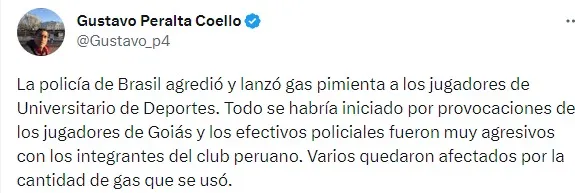 Todo se habría iniciado por provocaciones de los jugadores de Goiás y la policía fue muy agresiva con los integrantes del elenco de la U. Se informó que varios quedaron afectados por la cantidad de gas que se usó.
