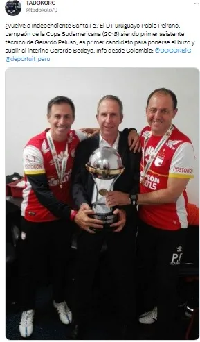 De hecho, Peirano es bien recordado en Independiente de Santa Fe, pues en el 2015 fue campeón de la copa Sudamericana, siendo asistente técnico de Gerardo Pelusso, quien logró el título nacional con Alianza Lima en el 2006.