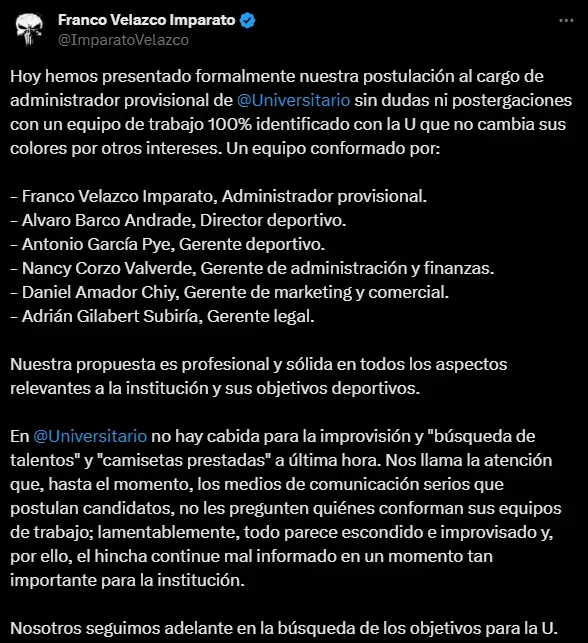 El favorito por los hinchas debido a que tiene el apoyo de Jean Ferrari es Franco Velazco Imparato. Quien ha trabajado con el club y que ahora se presenta como candidato para Administrador provisional. Mediante sus redes sociales ha dado a conocer más sobre sus propuestas, así como también un llamado al hincha para que crean en ellos. Su idea es continuar con el trabajo que ha venido haciendo la administración anterior.