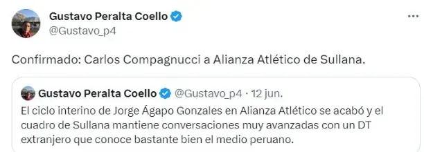 “Confirmado: Compagnucci a Alianza Atlético de Sullana”, publicó Gustavo Peralta en su cuenta de Twitter.