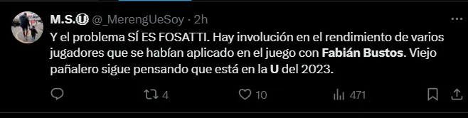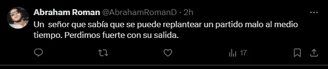 “No pensé extrañar a Bustos tan rápido”, “Un señor que sabía que se puede replantear un partido malo al medio tiempo. Perdimos fuerte con su salida” y “El problema sí es Fossati. Hay involución en el rendimiento de varios jugadores que se habían aplicado en el juego con Fabián Bustos“; son algunos de los comentarios más llamativos de los hinchas merengues sobre el DT argentino.