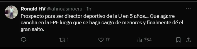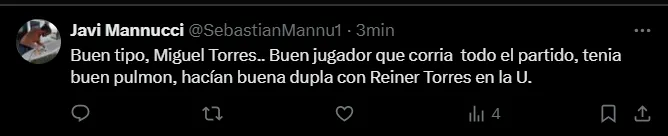 “Buen tipo, Miguel Torres. Buen jugador que corría todo el partido, tenía buen pulmón, hacían buena dupla con Rainer Torres en la U“, “Prospecto para ser director deportivo de la U en 5 años. Que agarre cancha en la FPF luego que se haga cargo de menores y finalmente de el gran salto” y “A todo crema se le desea el bien”; son algunos de los comentarios más llamativos de los hinchas tras conocer que Miguel Torres estará en el Área de Desarrollo de la FPF.