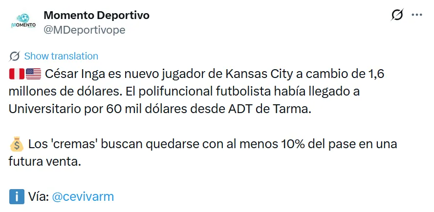 Dentro del acuerdo con el club estadounidense, Universitario negocia mantener al menos el 10% de los derechos económicos de César Inga. Esta disposición permitiría al elenco ‘merengue’ obtener ganancias en caso de una futura transferencia del jugador.