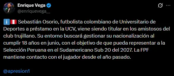 Sebastián Osorio es una de las joyas que tuvo las juveniles de Universitario, pero ahora forma parte del plantel profesional de la Universidad César Vallejo. Ahora, el periodista Enrique Vega reveló que la intención de este delantero colombiano es conseguir la nacionalización para representar a la Selección Peruana.