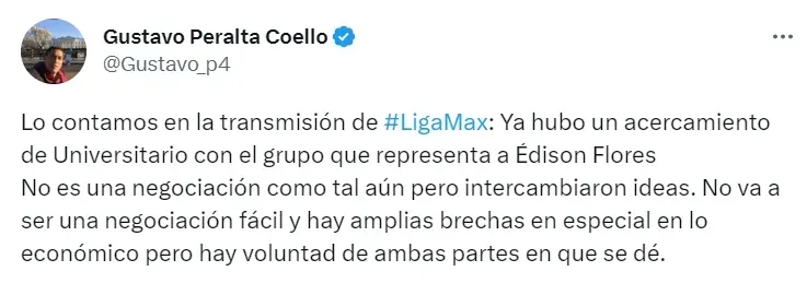 “Hubo un acercamiento de Universitario con el grupo que representa a Edison Flores. No es una negociación como tal aún, pero intercambiaron ideas”, empezó a exponer Gustavo Peralta en su cuenta de Twitter.