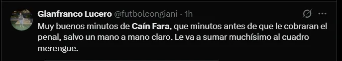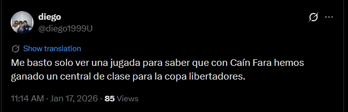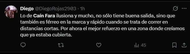 “Me bastó solo ver una jugada para saber que con Caín Fara hemos ganado un central de clase para la Copa Libertadores“, “Lo de Caín Fara ilusiona y mucho, no sólo tiene buena salida, sino que también es férreo en la marca” y “Muy buenos minutos de Caín Fara. Le va a sumar muchísimo al cuadro merengue”; fueron algunas de las reacciones más resonantes de los aficionados de Universitario de Deportes respecto al rendimiento del defensor argentino ante Sport Boys.