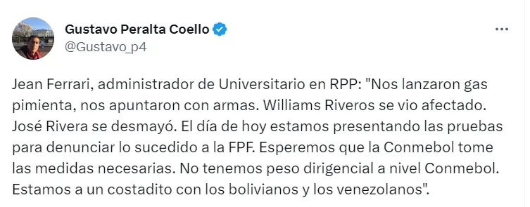 Al pasar a un segundo plano el aspecto deportivo, Jean Ferarri salió al frente y comentó los momentos de terror que vivió Universitario en Brasil. Atacados por la policía, el dirigente brindó detalles.