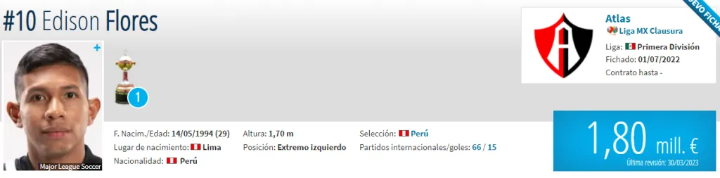 Es que el volante mantiene un costo de 1,80 millones de euros en el mercado. Dicha cifra figura en el portal Transfermarkt, desde el mes de marzo. En tanto, la plantilla crema se encuentra con un valor de 12,83 millones y si en caso se una Flores, estarían teniendo el precio de hasta 14,63 millones.