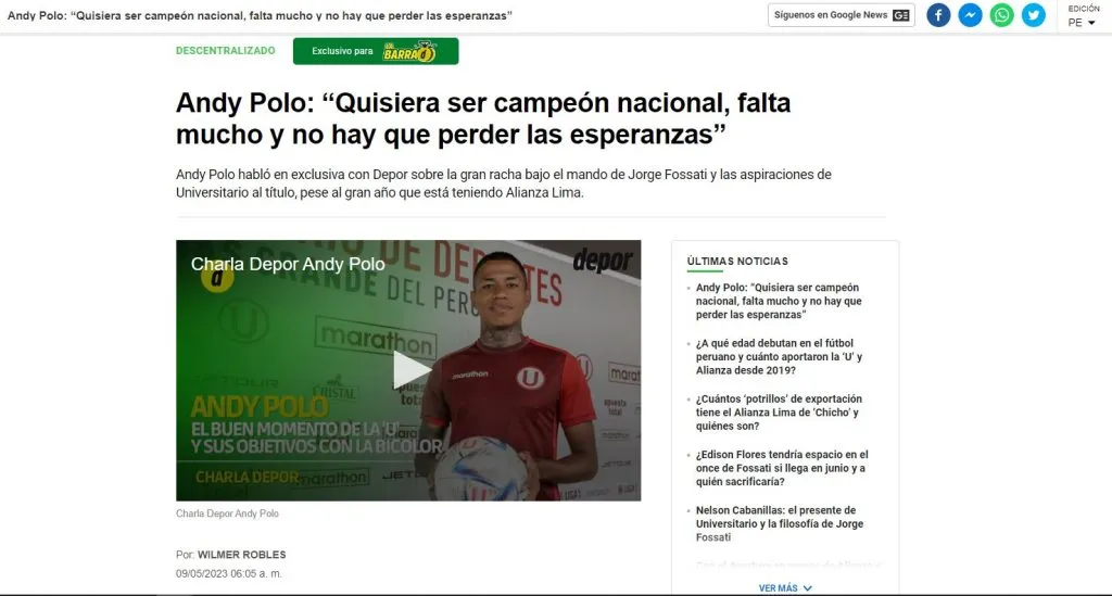 Andy Polo, hincha a muerte de Universitario de Deportes, tiene la chance de confiar en sus compañeros y sus cualidades para lo que resta de la temporada. La Joya dio una entrevista íntegra en Diario Depor, y destacó muchas cosas para comentar.