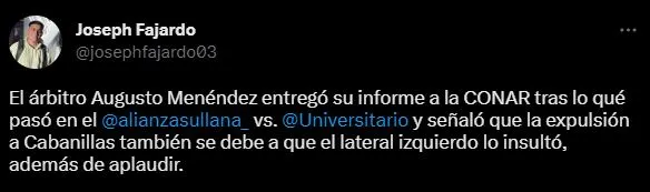 Ahora, con el paso de los días, se conoció qué puso el juez principal en su informe: “El árbitro Augusto Menéndez entregó su informe a la CONAR tras lo qué pasó en el Alianza Atlético de Sullana vs. Universitario de Deportes, y señaló que la expulsión a Cabanillas también se debe a que el lateral izquierdo lo insultó, además de aplaudir”.