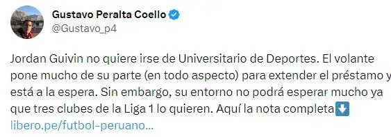 Según señaló es un equipo de la capital y dos de provincia, quienes ya le hicieron llegar la oferta, sin embargo, el jugador está dejando en claro que quiere mantener en Universitario. Guivin no juega oficialmente desde el 5 de marzo.