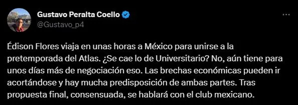 “Edison Flores viaja en unas horas a México para unirse a la pretemporada del Atlas. ¿Se cae lo de Universitario? No, aún tiene para unos días más de negociación eso. Las brechas económicas pueden ir acortándose y hay mucha predisposición de ambas partes. Tras la propuesta final, consensuada, se hablará con el club mexicano”. Sostuvo el comunicador de PBO Campeonísimo ¿Vuelve o no vuelve el nacido en tienda crema?