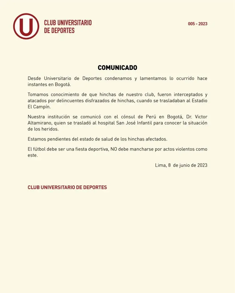 Asimismo, precisaron que la U se comunicó en todo momento con el cónsul de Perú en Bogotá.