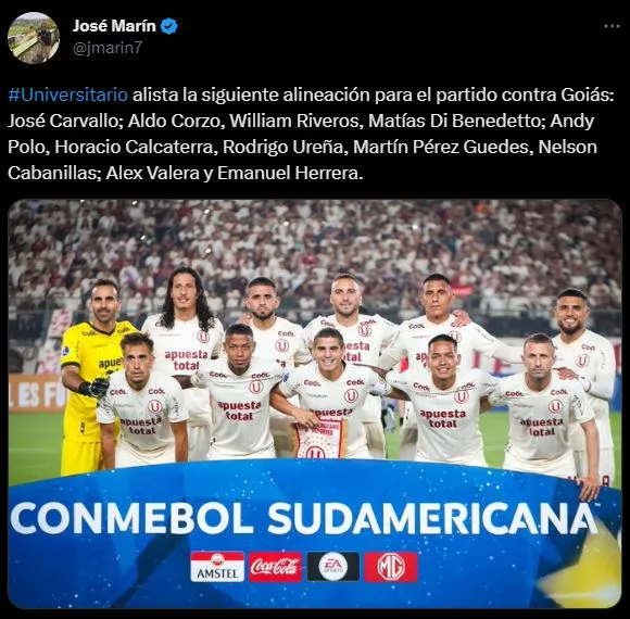 El periodista José Marín, lanzó cómo estaría parándose el conjunto merengue hoy: “Universitario alista la siguiente alineación para el partido contra Goiás: José Carvallo; Aldo Corzo, William Riveros, Matías Di Benedetto; Andy Polo, Horacio Calcaterra, Rodrigo Ureña, Martín Pérez Guedes, Nelson Cabanillas; Alex Valera y Emanuel Herrera”.