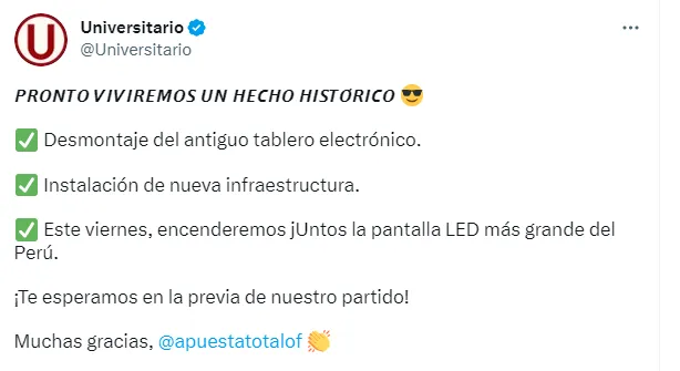 “Desmontaje del antiguo tablero electrónico. Instalación de nueva infraestructura. Este viernes, encenderemos jUntos la pantalla LED más grande del Perú”, escribieron.