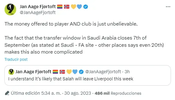 El exjugador y reportero de ESPN, Jan Aage Fjørtoft ha asegurado por medio de su cuenta oficial de Twitter que el egipcio saldrá de Anfield. “Entiendo que es probable que Salah deje el Liverpool esta semana. El dinero ofrecido al jugador y al club es simplemente increíble“.