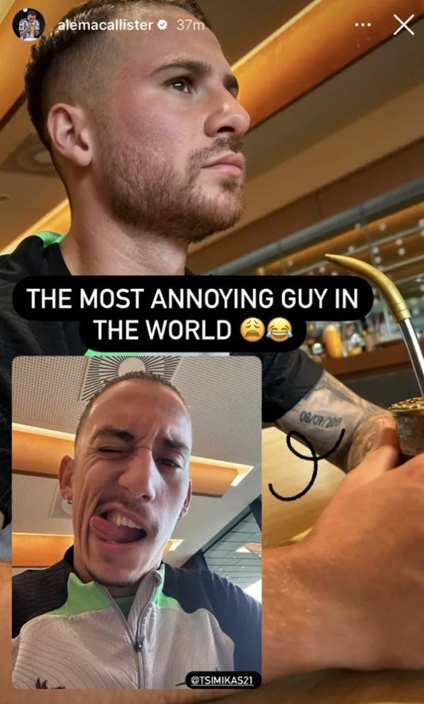 En este caso, la broma fue con Kostas Tsimikas, el lateral izquierdo griego que suele entrar desde el banco cuando Robertson no está disponible para jugar. Y, en su cuenta de Instagram, Mac Allister subió una captura de Tsimikas haciendo una cara un tanto chistosa, con la descripción de “el tipo más molesto del mundo”.