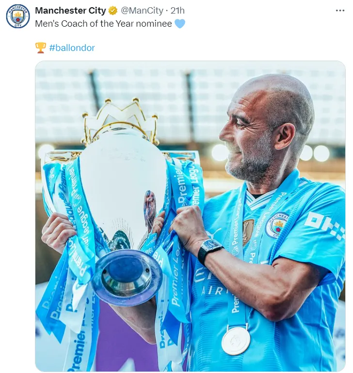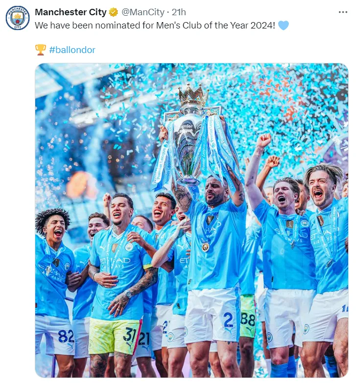Apenas se conocieron los candidatos, la cuenta oficial del Manchester City en X fue reaccionando. Primero destacó la presencia de Savinho como nominado al Trofeo Kopa (mejor jugador joven), aunque por lo que hizo en Girona y no en el club ingés, al que acaba de sumarse. Después fue el turno de destacar a Guardiola y al club, en ambas oportunidades posteando fotos de los festejos con la última Premier League.