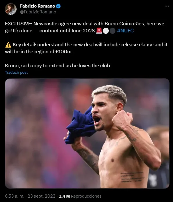 El volante central brasileño, Bruno Guimaraes, ha cerrado un nuevo acuerdo con el Newcastle United y seguirá con el equipo hasta junio del 2028. En el contrato se incluye una cláusula aumentada, que ronda los 100 millones de libras.