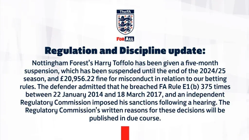 “El jugador del Nottingham Forest, Harry Toffolo, ha recibido una suspensión de cinco meses, la cual será suspendida hasta el final de la temporada 2024/25 y una multa de 20,956.22 libras esterlinas por conductas inapropiadas en relación con nuestro reglamento de apuestas.