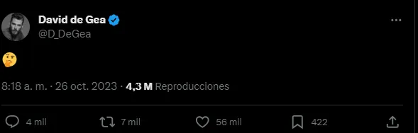 Tras estos rumores, que se hicieron viral en los medios deportivos de todo el mundo, De Gea, que tuvo 12 temporadas en el arco del United, se expresó en su cuenta de X (Twitter). A veces, un ‘emoji’ vale más que mil palabras: el español subió una carita pensativa. ¿Qué querrá decir?