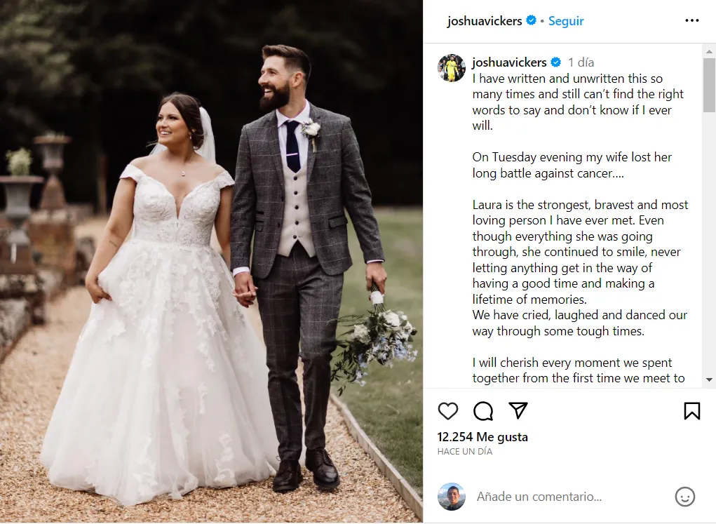 Están siendo tiempos duros para el portero inglés, Josh Vickers. A solo tres meses de su boda, su esposa Laura ha fallecido. La mujer de 27 años perdió la vida luego de una dura batalla conta el cáncer. Esto ha sido confirmado por el propio futbolista en sus redes sociales.