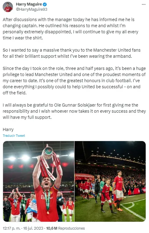 Por medio de un comunicado en sus redes sociales, Harry Maguire confirmó que ya no seguirá siendo el capitán de Manchester United. El inglés agradeció a los fanáticos por haberle confiado tal responsabilidad.