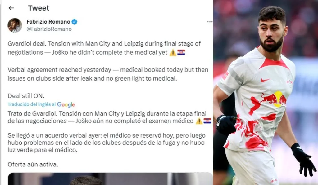 “Tensión con Man City y Leipzig durante la etapa final de las negociaciones…Josko aún no completó el examen médico…Se llegó a un acuerdo verbal ayer: el médico se reservó hoy, pero luego hubo problemas en el lado de los clubes después de la fuga y no hubo luz verde para el médico. Oferta aún activa”, palabras de Fabrizio Romano en sus redes sociales y cuenta de Twitter.