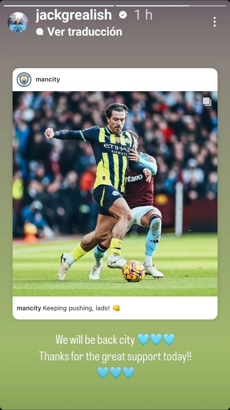 ”Volveremos a ser nosotros. Gracias por el gran apoyo de hoy”, escribió el delantero del elenco ciudadano en una de sus historias de su cuenta de Instagram, luego de la caída que los dejó estancados en 27 unidades (quedó a 9 del líder Liverpool).