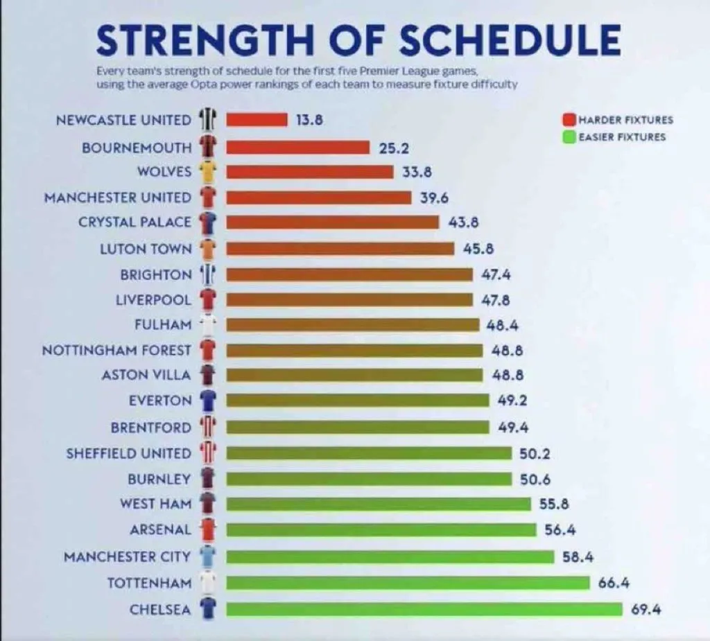 Los coeficientes de Opta marcaban un 69,4% para el Chelsea, mientras que en la otra punta estaba el Newcastle, con un 13,8%. Y si bien el enfrentamiento inicial del Chelsea fue ante Liverpool (empate 1-1), luego tenía por delante a West Ham, Luton Town, Nottingham Forest y Bournemouth.